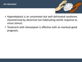 As síndromes de sobressalto anormais são classificadas em hiperecplexia, induzidas por estímulos e síndromes de sobressalto neuropsiquiátricos. A hiperecplexia é atribuída a uma causa genética, idiopática ou sintomática. A hiperecplexia hereditária é um distúrbio neurogenético tratável. Em pacientes com uma resposta de sobressalto hiperativa, o primeiro passo é caracterizar a extensão e as associações da ‘resposta’. Causas secundárias ou sintomáticas são particularmente importantes em crianças, pois fornecem pistas clínicas úteis para distúrbios neurodegenerativos ou de desenvolvimento neurológico subjacentes. Atenção especial deve ser dada a qualquer neonato ou lactente com rigidez generalizada ou episódica, convulsões refratárias a medicamentos, apneia recorrente, estados comportamentais sensíveis a estímulos ou síndrome de morte súbita infantil. Induzir um reflexo de retração da cabeça não habitual a batidas repetidas no nariz deve fazer parte do exame de rotina de todos os recém-nascidos. A manobra de Vigevano deve ser ensinada a todas as famílias e profissionais de saúde como uma medida de resgate de emergência. O início do sobressalto excessivo após a infância deve direcionar as investigações para uma causa adquirida, como lesão do tronco cerebral, anticorpos contra receptores de glicina e neurodegeneração. Finalmente, não se deve esquecer de avaliar casos inexplicados de marcha anormal e quedas frequentes em adultos para síndromes de sobressalto subjacentes não diagnosticadas. O clonazepam oral é uma terapia eficaz além de intervenções comportamentais e de segurança para casos hereditários. Os resultados em casos genéticos são bons em geral.